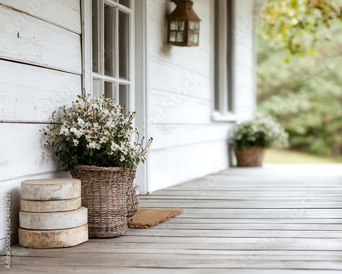 Naklejka premium Wooden home with flowerfilled boxes, soft glow, and rustic porch arrangement