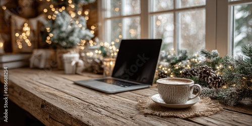 Obraz premium Wooden home workplace with laptop, cappuccino, christmas decoration, cozy...