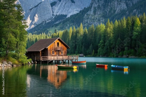 © Hameeda, Fototapeta premium Wooden House and Boats on Pragser Wildsee Lake