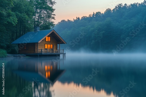 Fototapeta premium Wooden house by the lake surrounded by mist and forest at dawn