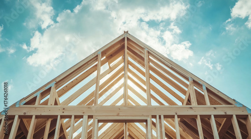 © jex, Fototapeta premium Wooden house frame stands under blue sky with sunlight shining through, highlighting construction progress and natural materials.