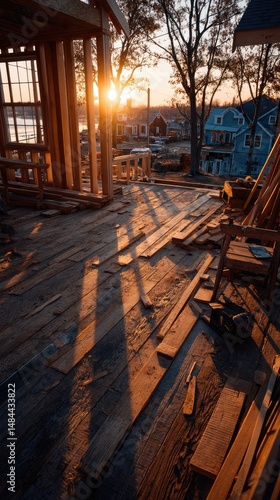 © wang, Fototapeta premium Wooden house frame under construction, aerial view at sunset with warm golden light and long shadows. A new home takes shape in the golden hour.