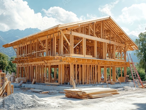Fototapeta premium Wooden house under construction, clear sunny sky, mountainous background, beams exposed, natural building materials, active outdoor site