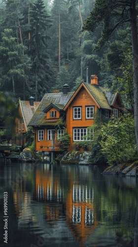 © Oksana, Fototapeta premium Wooden house with a mossy roof reflecting in a lake, surrounded by dense forest.