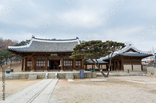 Fototapeta premium Wooden house with black tiles of Hwaseong Haenggung Palace loocated in Suwon...