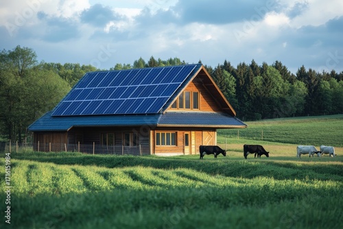 Fototapeta premium Wooden house with solar panels on roof cows grazing in green meadow at sunrise