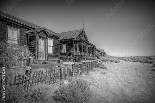 © John, Obraz premium Wooden houses line a dusty street in Bodie Ghost Town, California. This well-preserved slice of the Old West offers a glimpse into 19th-century frontier life in a remote desert setting.