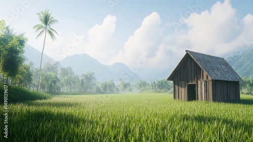 © mas, Obraz premium Wooden hut in misty rice paddy, mountains background; serene landscape