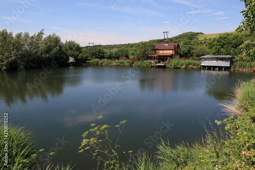 Fototapeta premium Wooden hut on the shore of a small pond