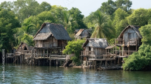 Obraz premium Wooden Huts on Stilts Surrounded by Lush Jungle Landscape