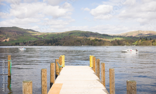 Naklejka premium Wooden jetty and boats on Lake Windermere, Lake District, UK