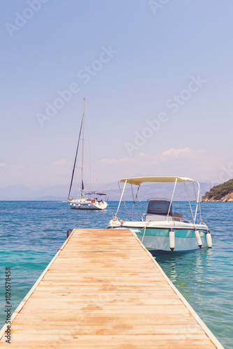 Fototapeta premium Wooden jetty leading to boats and calm sea on a sunny summer day