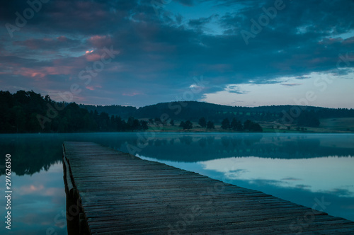 © robert, Naklejka premium wooden jetty on lake at sunrise.