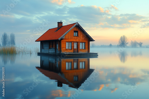 © Johanddss, Fototapeta premium Wooden Lake House Reflecting Sunset Sky