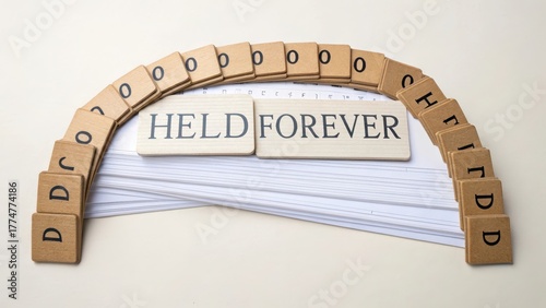 © NURUL, Obraz premium Wooden Letter Tiles Forming the Phrase Held Forever on Background