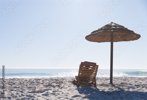 Fototapeta premium Wooden lounge chair draped red towel standing under straw parasol on beach facing sea, copy space