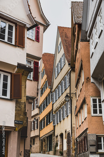 © Roberto, Fototapeta premium Wooden medieval building with typical pitched roof on a narrow street or alley. Historical German facade or exterior with traditional louvered shutters (jalousie) and sloping roof - Tubingen, Germany
