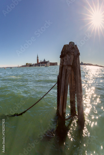 Fototapeta premium Wooden mooring post with chains in foreground and San Giorgio Maggiore island in background in Venice, Italy