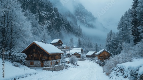 Naklejka premium Wooden mountain houses covered by snow during winter in the alps
