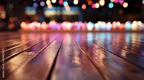 Fototapeta premium wooden oak wood floor for product display, bottom angle, gaussian blur background with rainbow light