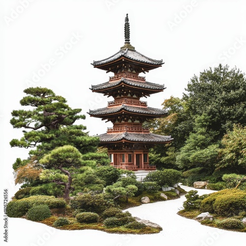 © Murda, Obraz premium Wooden pagoda, serene garden, landscaped path.