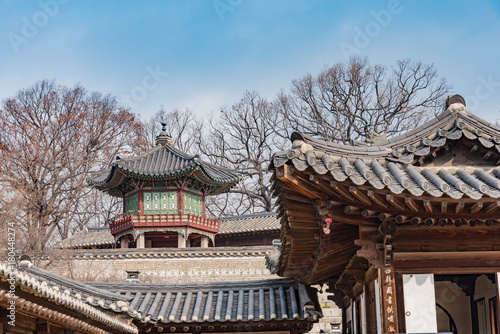 Naklejka premium wooden pagodas in the park of seoul city in korea in winter