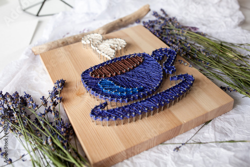 Fototapeta premium Wooden panel in string art technique, thread pattern, handmade