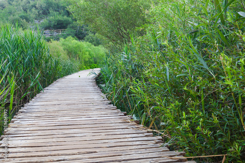 Obraz premium Wooden path across beautiful lake in sunny green forest