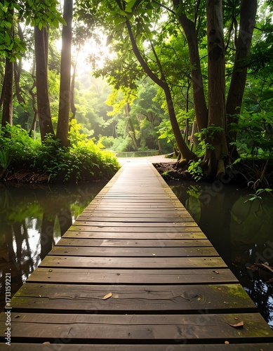 Obraz premium Wooden path through a tranquil forest, sunlight filtering through trees