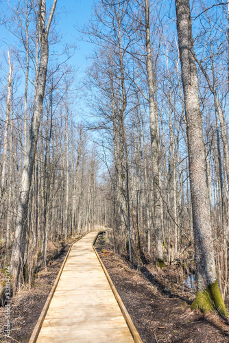 Obraz premium Wooden Path through Wetlands in Spring in Northern Europe
