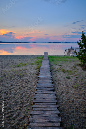 © Юрий Т, Fototapeta premium wooden path to the lake at sunset