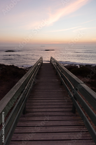 © jlramos, Fototapeta premium wooden path to the sea while sunset with boats in the background