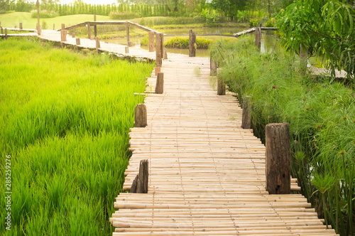 © peerayot, Fototapeta premium Wooden path way over meadow.