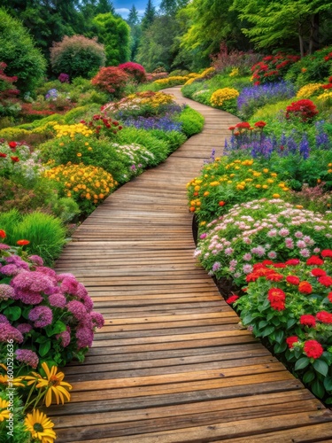 © Ningjing, Obraz premium Wooden path winding through vibrant garden of colorful flowers