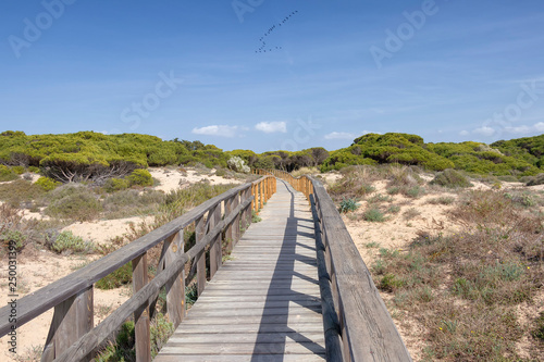 © Alfredo, Fototapeta premium Wooden pathway over dunes and pines at beach in Punta Umbria, Huelva. Los Enebrales beach