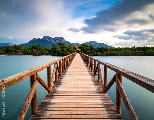 © Cah, Obraz premium Wooden pathway stretching toward mountainous terrain under dramatic sky scape