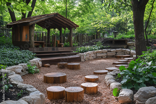 © Design Adelsa, Obraz premium Wooden Pavilion and Stone Pathway in a Lush Forest Setting