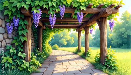 © olgadanilina, Fototapeta premium Wooden pergola covered with purple flowers