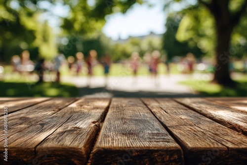 © grey, Fototapeta premium Wooden picnic table surface in sharp focus with blurred park background, symbolizing leisure and outdoor lifestyle.
