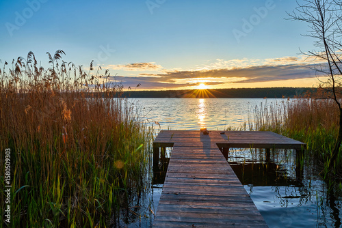 © Ryzhkov Oleksandr, Naklejka premium Wooden pier at sunrise over calm lake with reeds and forest.