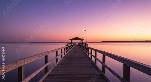 © Bora, Fototapeta premium Wooden Pier at Sunset Over Calm Water.