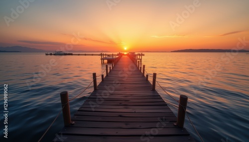 © ILIUSIA, Fototapeta premium Wooden pier at sunset with the sun setting over the horizon and boats in the distance