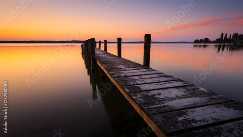Naklejka premium Wooden pier extending into a calm lake at sunset with vibrant orange and...