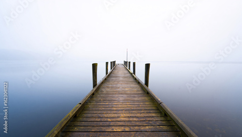 © Sumon, Fototapeta premium Wooden Pier Extending into a Misty Calm Lake with Wooden Posts dock jetty