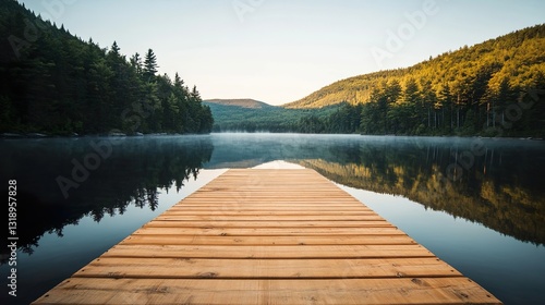 © lucegrafiar, Naklejka premium Wooden pier extending into a misty lake at sunrise
