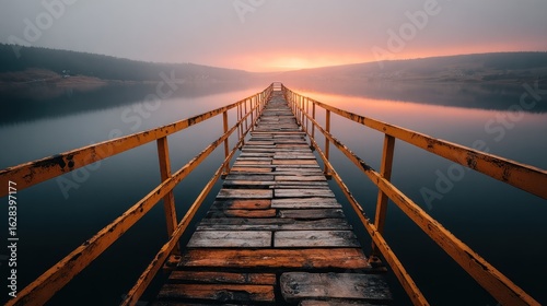 © ROY, Naklejka premium Wooden pier extending into a tranquil lake at sunrise