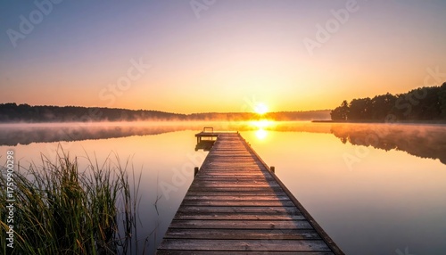 © tasyarika, Fototapeta premium Wooden Pier Extending Into Calm Lake at Sunrise with Golden Light and Gentle Mist Rising from the Water Creating a Serene Morning Atmosphere