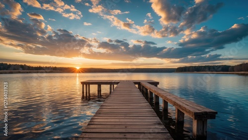 © The 2R Artificiality, Obraz premium Wooden pier extending into calm lake at sunset with dramatic clouds and reflections on water surface