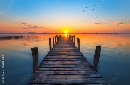 © Riz, Obraz premium Wooden Pier Extending Into Calm Lake Sunrise