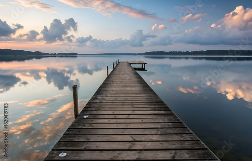 Naklejka premium Wooden pier extending into calm lake with soft clouds reflected in water,...